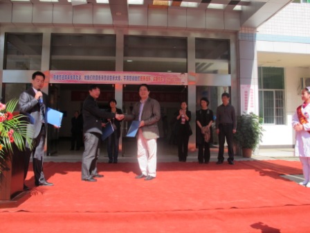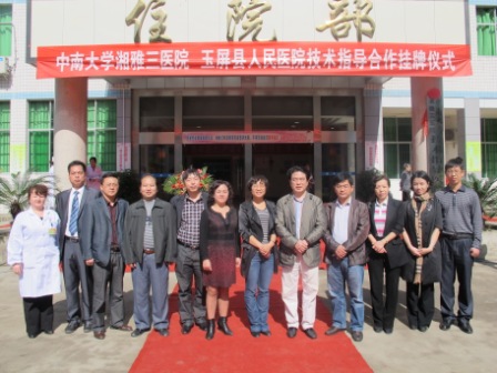 10月17日,中南大学湘雅三医院与贵州省玉屏侗族自治县人民医院技术指导医院签约挂牌仪式在玉屏侗族自治县人民医院住院部大楼前隆重举行。湘雅三医院副院长叶启发与玉屏侗族自治县人民政府副县长杨云为“中南大学湘雅三医院技术指导医院”揭牌,这标志中南大学湘雅三医院区域医疗联盟继帮扶青藏高原西藏贡嘎县外,又迎来了云贵高原的新成员,更是中南大学湘雅三医院医院领导班子先行先试,对口帮扶国家连片特困地区—武陵山区扶贫开发工作的又一举措。中南大学湘雅三医院移植中心副主任明英姿、社会服务部主任赵颜忠、护理部吴小霞、普外科佘兴国以及玉屏侗族自治县县委县政府部分领导也参加了签约挂牌仪式。
