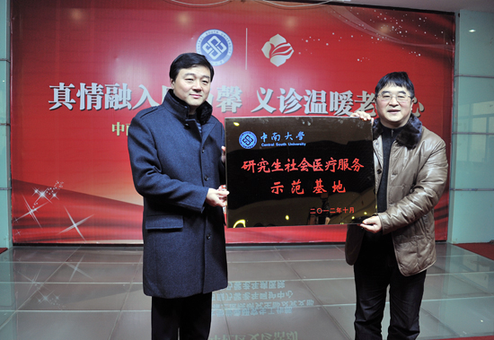 中南大学党委研工部部长白毅向湖南康乃馨养老产业投资置业有限公司董事长李重九正式授牌。