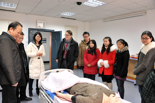 代表团一行首先来到了临床技能中心,该中心工作人员简要介绍了中心的建设背景、实验教学体系等,陪同参观的八年制学生还就中心主要功能、开放使用情况等向来宾做了讲解。