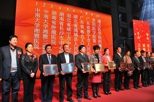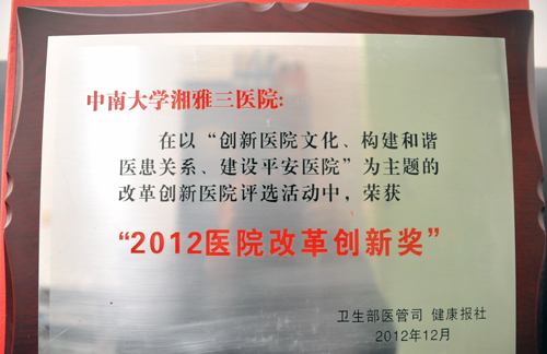 1月12日,由卫生部医管司、健康报社共同主办,主题为“创新医院文化、和谐医患关系、创建平安医院”的医院改革创新亮点评选活动颁奖典礼,在北京天伦王朝大酒店举行。中央综治办协调室巡视员季勤,卫生部医管司副司长孙阳、何红,司法部基层司副司长王学泽,健康报社长兼总编辑王硕,驮人集团董事长王国胜等出席会议。会上,对荣获“2012年度医院改革创新奖”的90家医院进行了表彰,中南大学湘雅三医院上榜,院长陈方平应邀参会并受奖。