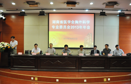 湖南省医学会阎翰副秘书长,湖南省外科学会副主任委员尹邦良教授,湖南省医学会胸外科学专业委员会主任委员喻风雷教授,湘雅三医院副院长朱晒红教授,北京大学肿瘤医院胸外一科主任陈克能教授,上海市肺科医院胸外科朱余明教授,湖南省医学会胸外科学专业委员会副主任委员、湘雅三医院心胸外科主任刘建新教授等领导和专家在主席台就座。来自省会及各地(州、市)100余名胸外科同行参会,大会开幕式由湘雅三医院心胸外科金龙玉副教授主持。