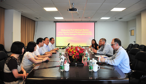 6月27日上午,澳大利亚Flinders大学校长Michael Barber、Lucie Walters教授等一行5人在中南大学国际合作与交流处副处长伍志刚的陪同下来到湘雅三医院进行交流访问。湘雅三医院院长陈方平、党委副书记邓云龙接待了来访客人。