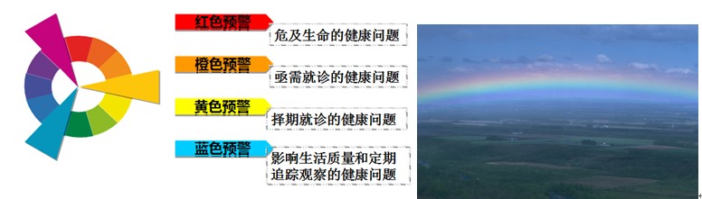 这套预警体系,首先针对九类慢性病(高血压病、2型糖尿病、血脂异常、冠心病、超重及肥胖、骨质疏松、恶性肿瘤、慢性肾脏病、慢性阻塞性肺疾病)按照依次为红、橙、黄、篮不同的颜色分级标准预警,建立了健康风险识别、动态跟踪风险机制,以及相应的管理原则、监测路径,并采取相应的管理措施。这是一套科学的健康管理办法,它将复杂难懂的诸多疾病和健康问题的罗列转变成条理清楚的颜色分级,使管理者和被管理者都能容易的分清主次,对主要健康问题进行重点干预,为健康“未雨绸缪”,为风险“适时而督”。