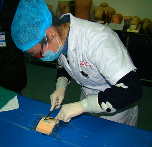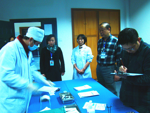 参加本次考核的对象为2012级临床医学专业学位研究生共126人,其中博士研究生19名、硕士研究生107名。根据培养方案,共设置了12个站点,考核内容涉及到胸穿、腹穿、骨穿、心脏检查 心电图、男性导尿、缝合打结、拆线换药 消毒铺巾、心肺复苏 胸片等项目。此次考核采取由同学们抽签随机确定各自考核项目的方式,每个项目考核8分钟,12名考核专家严格按照评分标准对临床医学专业学位研究生的每一项实践操作进行逐项打分。