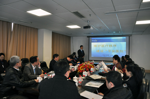 督导组首先听取了湘雅三医院医务部副主任、医疗安全办主任严文广《维护医疗秩序,建设“平安医院”》的报告。报告就目前医患关系的各种影响因素及湘雅三医院相关安全新举措进行了介绍。