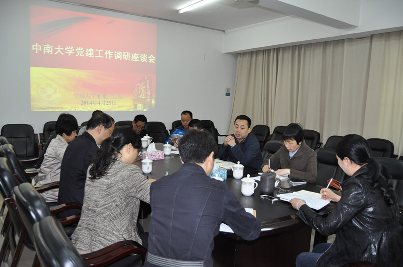 4月25日上午,中南大学党建工作调研组组织部副部长罗永忠、副处级组织员邹庆林、研工部副部长姚勇一行3人来到湘雅三医院,围绕“加强教师党支部和研究生党支部活动,推进服务型党组织建设”主题召开座谈会。院党委书记罗爱静,党委副书记、纪委书记吴希林,党办主任陈亚南,8名党支部书记参加会议。