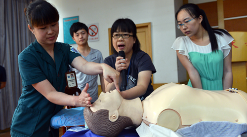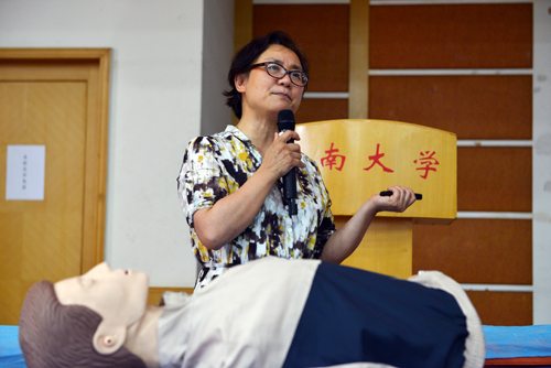 危急重症科主任杨明施用诙谐幽默的语言和生动鲜活的事例,为同学们讲解了“判断一个人是否需要急救”、“检查是否能自主呼吸……”,并和龙艳琼护士长一道为大家示范了心肺复苏、海姆里克急救法、外伤包扎、骨折固定等操作。医务人员仔细讲,同学们认真听讲,特别是心肺复苏演练,让同学们感到既新鲜又好奇,一些同学在医务人员的指导下亲手操作,体验到了急诊抢救的专注和付出。急救知识进校园,不仅丰富了大学生们的科普知识,还增强了大家的安全意识,受到广大师生欢迎。