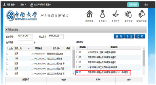 第二步:选择正确项目和项目起止时间,勾选模板16,点击查询。(注意:决算数截止日期为2021年12月31日。)