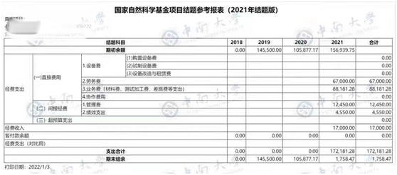 (2)《国家自然科学基金项目结题参考报表》(2021年结题版)通过财务平台查询系统打印带有“中南大学”水印版,一式一份。