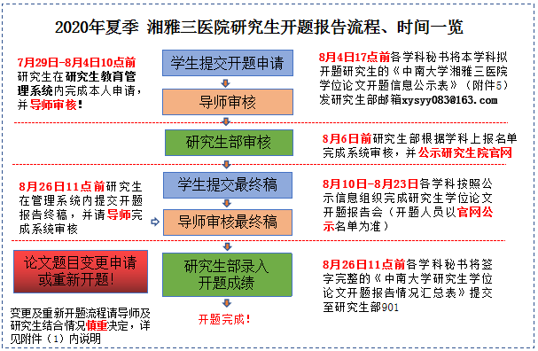 学位论文开题报告是学位论文工作的重要环节,是保证学位论文质量、顺利进行学位论文工作的重要基础。根据《中南大学研究生学位论文开题管理办法(中大研究生院字[2017]6号)》以及新修订的《中南大学研究生培养环节工作管理办法》(中大研字[2019]57号)文件湘雅三医院拟于729日至826日期间开展2020夏季研究生开题工作。本次开题总体流程时间安排如下: