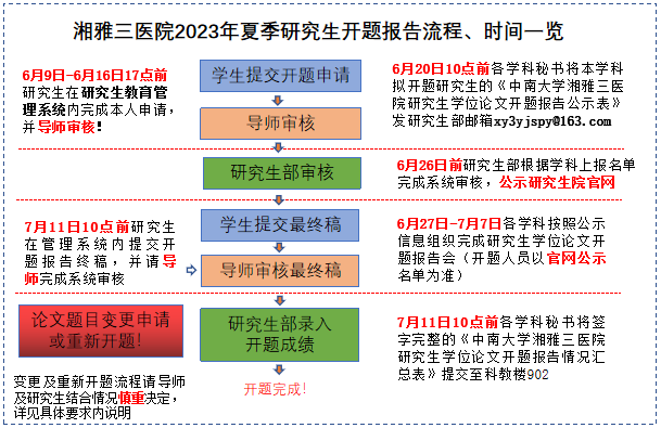 学位论文开题报告是学位论文工作的重要环节,是保证学位论文质量、顺利进行学位论文工作的重要基础。根据《中南大学研究生培养环节工作管理办法》(中大研字[2019]57号)文件和医院工作的整体安排,湘雅三医院拟于6月9日至7月11日期间开展2023年夏季研究生学位论文开题工作。本次安排如下: