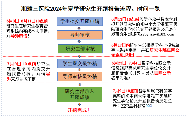 学位论文开题报告是学位论文工作的重要环节,是保证学位论文质量、顺利进行学位论文工作的重要基础。根据《中南大学研究生培养环节工作管理办法》(中大研字[2019]57号)文件规定(附件1)和医院工作的整体安排,湘雅三医院拟于6月3日至7月9日期间开展2024年夏季研究生学位论文开题工作。本次安排如下: